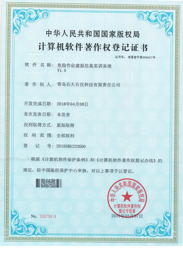 19 | 危险作业虚拟仿真实训系统V1.0 | 软著第3644417号 | 2019.03.07 |