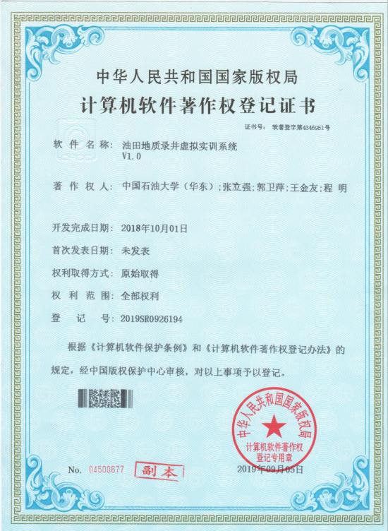 26 | 油田地质录井虚拟实训系统V1.0 | 软著第4346961号 | 2019.09.05 |