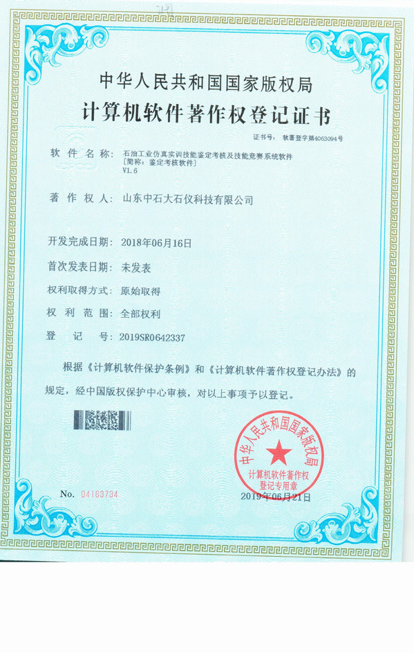 24 | 石油工业仿真实训技能鉴定考核及技能竞赛系统软件简称:鉴定考核软件V1.6 | 软著第4063094号 | 2019.06.21 |