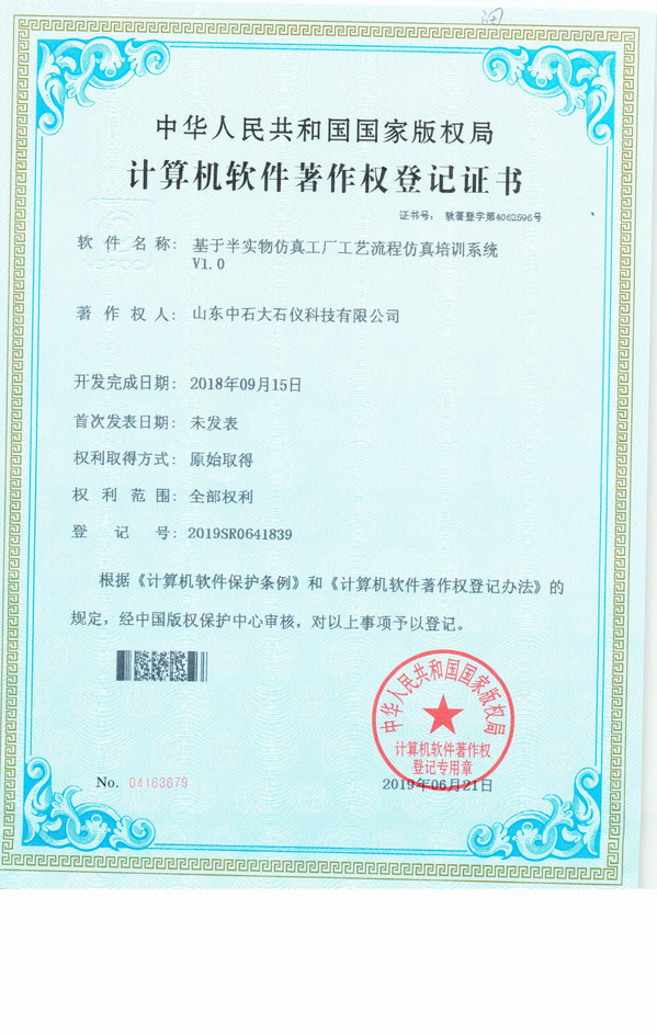10 | 危险化学品安全生产模拟仿真实训系统V1.0.0.1 | 软著第3639282号 | 2019.03.06 |