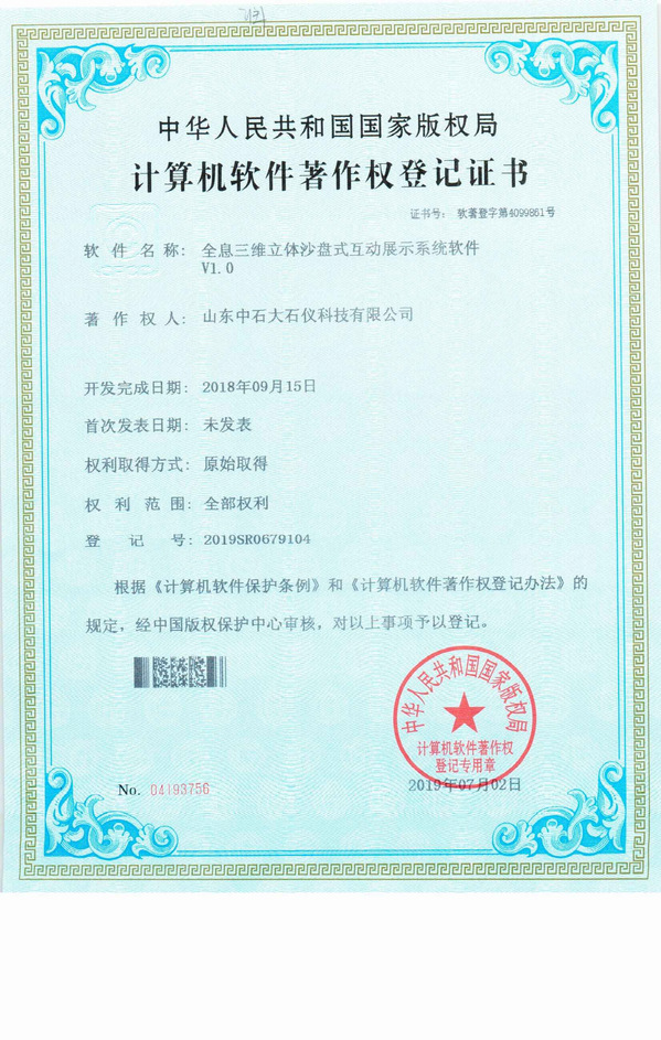20 | 全息三维立体沙盘式互动展示系统软件V1.0 | 软著第4099861号 | 2019.07.02 |