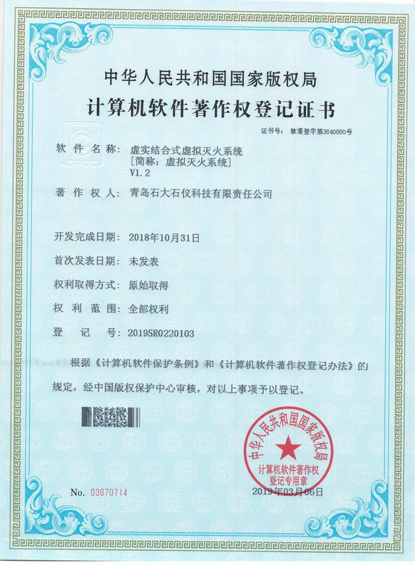 16 | 虚实结合式虚拟灭火系统简称:虚拟灭火系统V1.2 | 软著第3640860号 | 2019.03.06 |