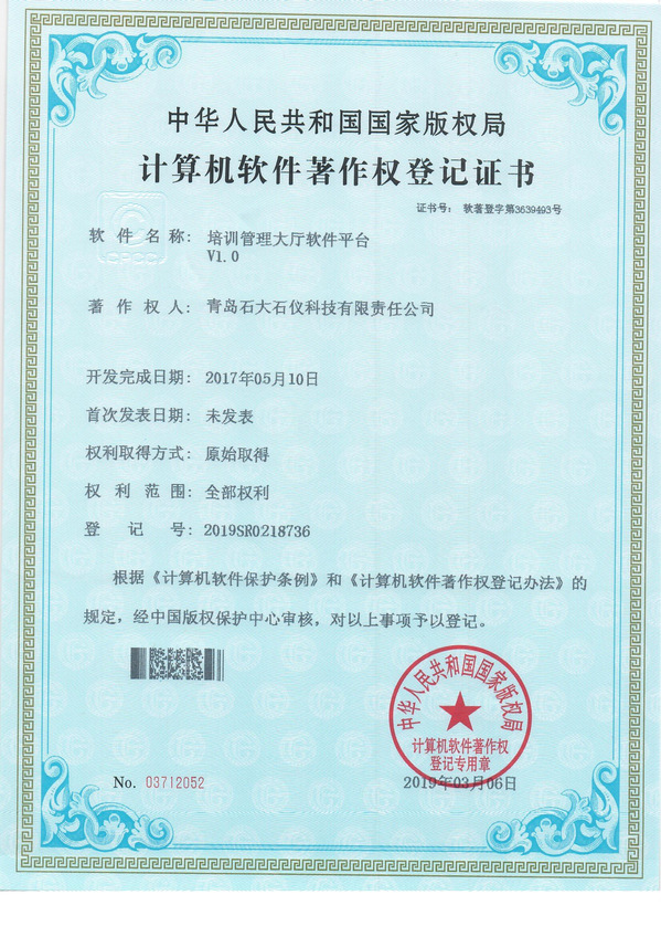 12 | 培训管理大厅软件平台V1.0 | 软著第3639493号 | 2019.03.06 |