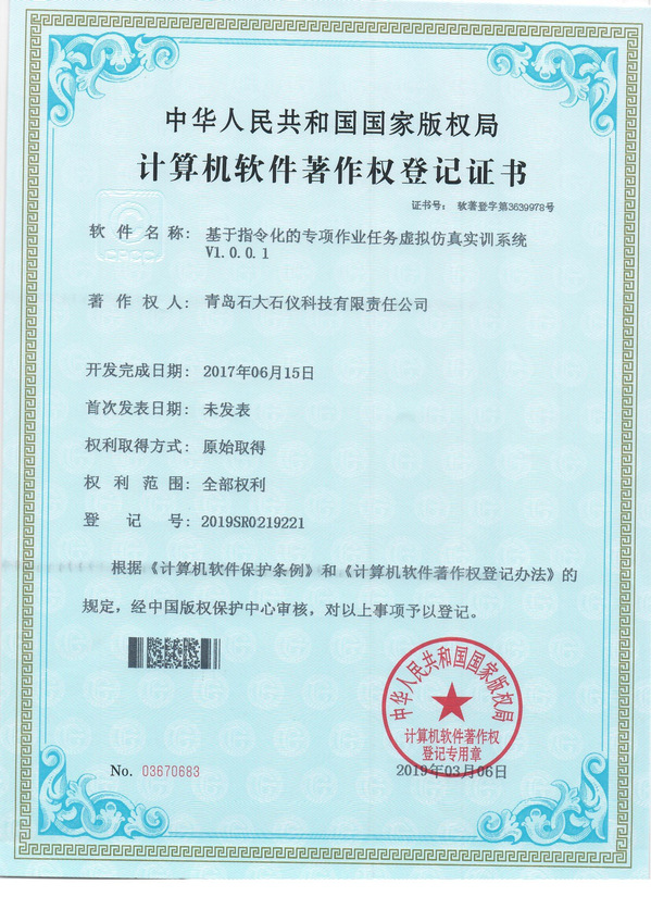 9 | 基于指令化的专项作业任务虚拟仿真实训系统V1.0.0.1 | 软著第3639978号 | 2019.03.06 |