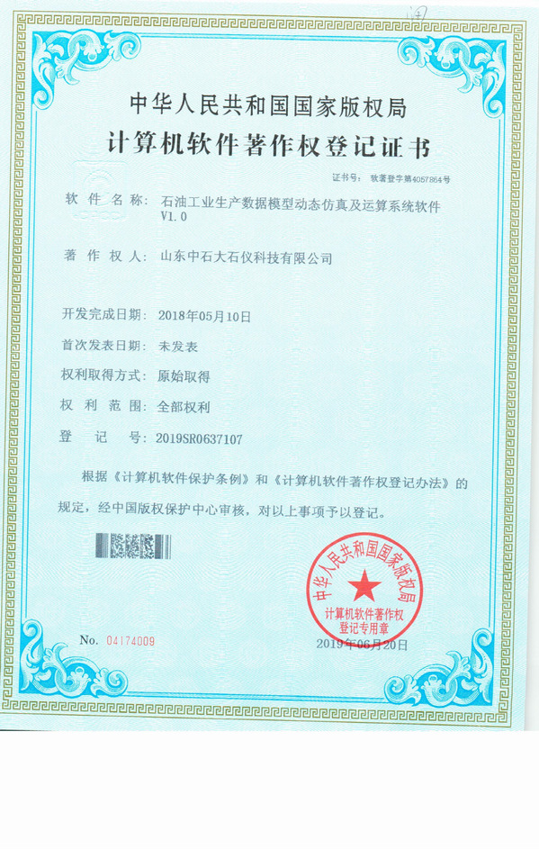 21 | 石油工业生产数据模型动态仿真及运算系统软件V1.0 | 软著第4057864号 | 2019.06.20 |