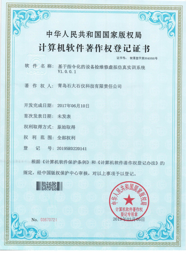 18 | 基于指令化的设备维修虚拟仿真实训系统V1.0.0.1 | 软著第3640898号 | 2019.03.06 |