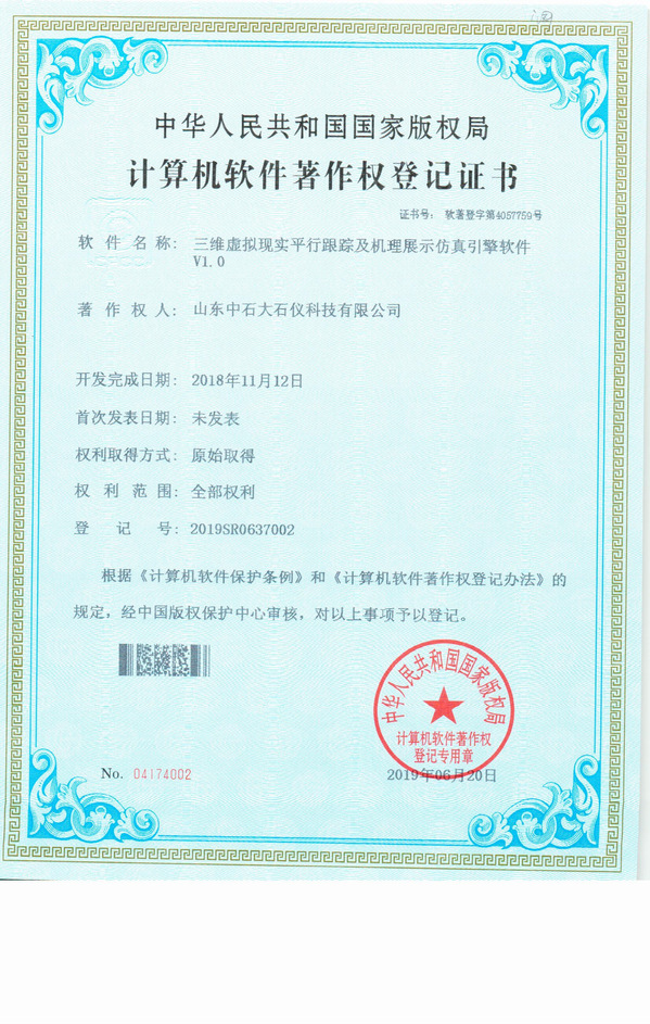 7 | 基于虚拟现实的固井仿真实训系统V1.0 | 软著第1837699号 | 2017.06.10 |