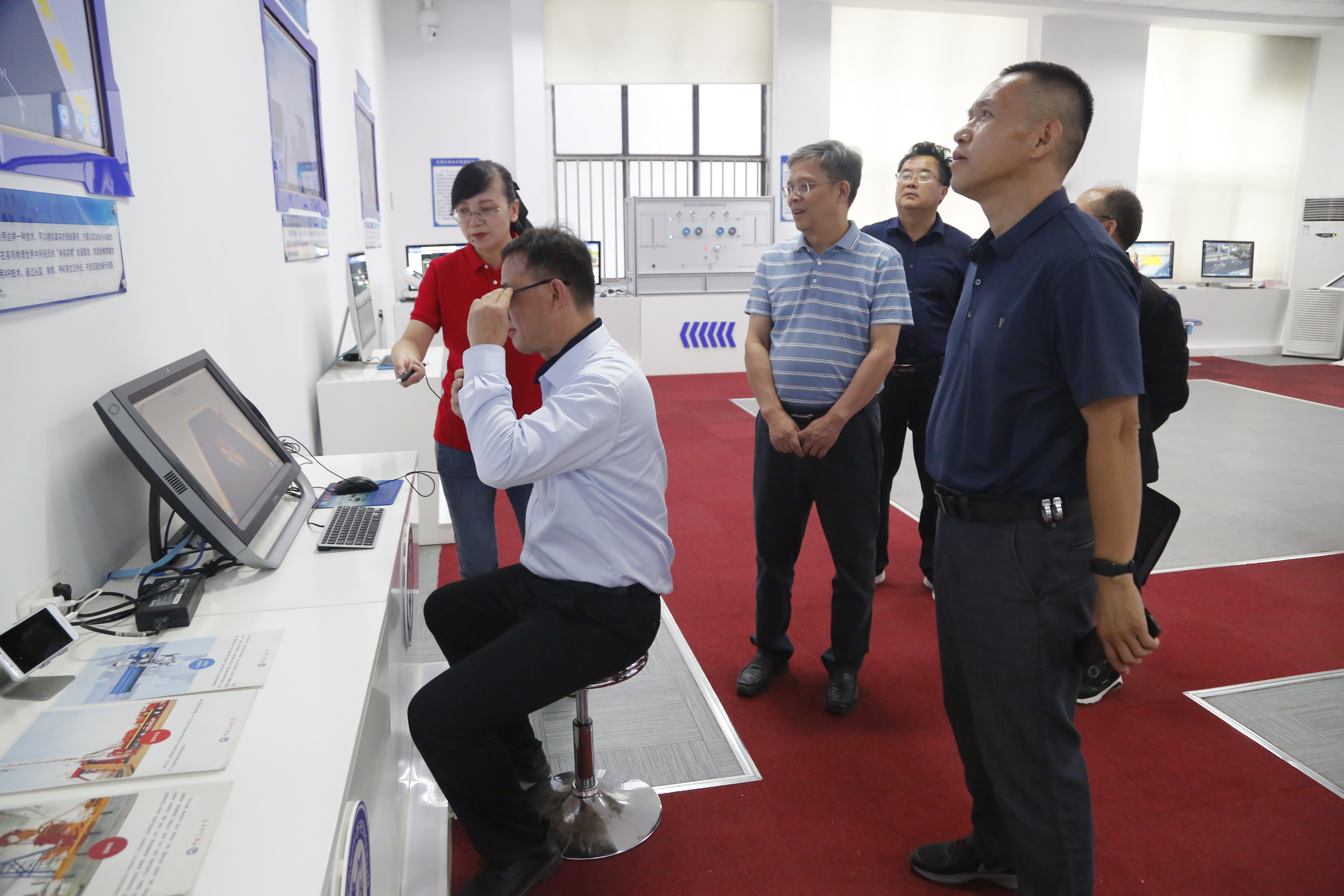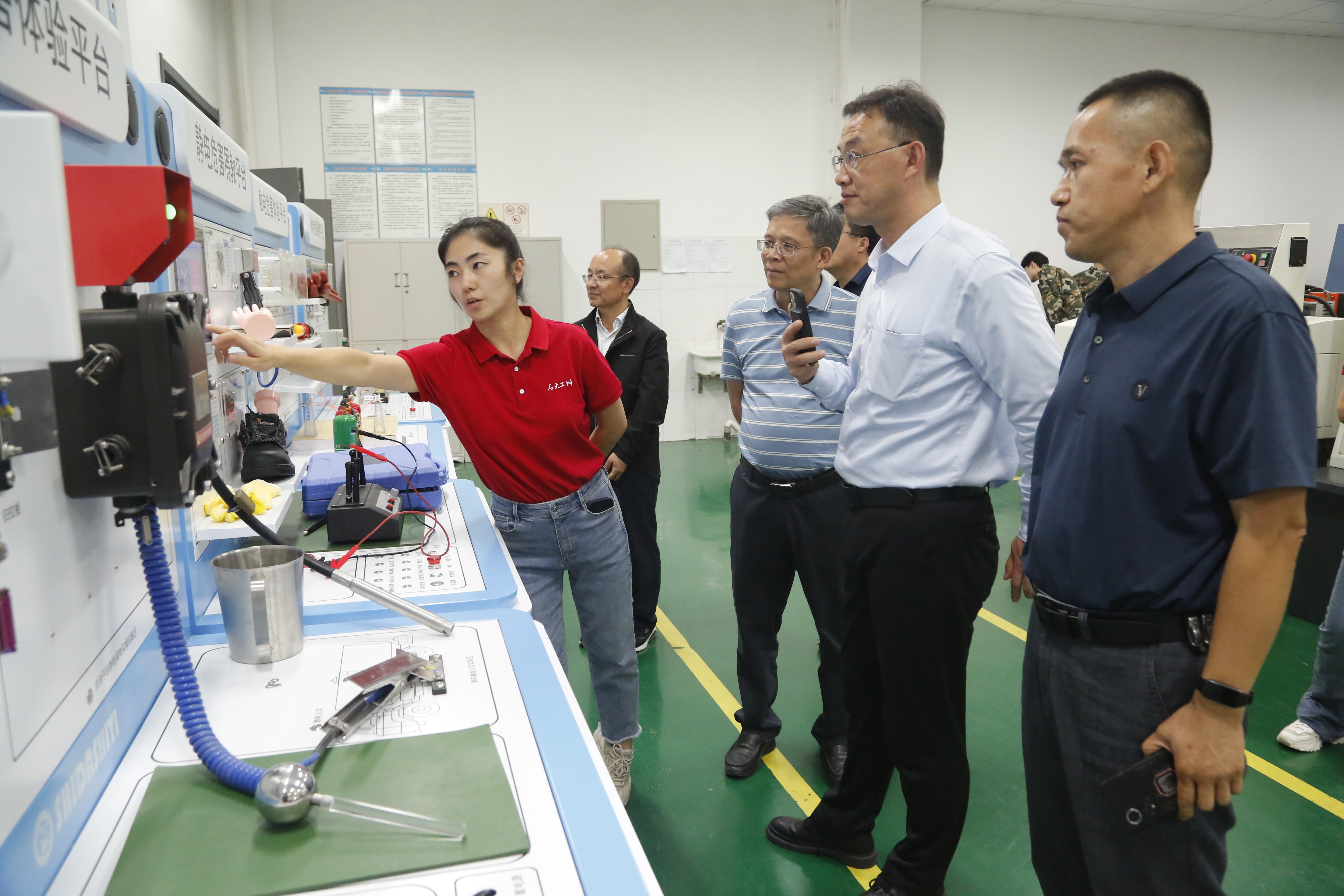 张主任一行参观了中心的现代加工技术实训室、虚拟仿真体验室和钻井、采油、集输等石油特色实训室,对中心自主研发的钻井仿真实训系统、机械电气类伤害模拟体验平台,以及相关的仿真实训装置和虚拟仿真教学资源通过实地交流进行了详细了解。中心相关负责人就中心的发展历程、教学科研、人才培养、实训基地建设和教学科研仪器设计生产等业务做了详细介绍。