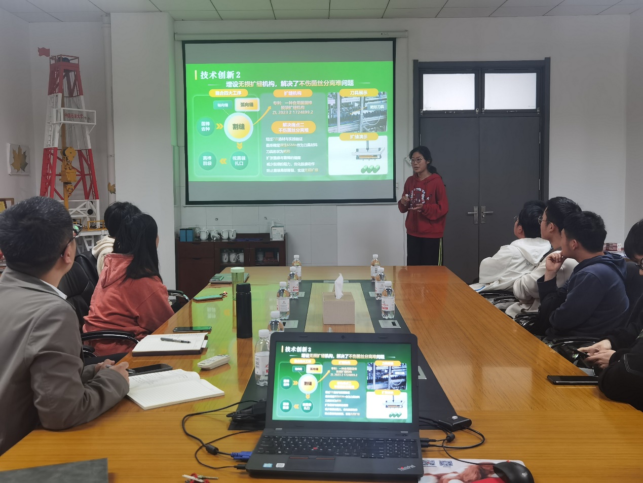 菌棒脱袋项目是中国国际大学生创新大赛的种子项目。答辩选手从背景、技术、意义、展望等方面明确阐述观点,论据清晰可靠,充分展现了菌棒脱袋设备对食用菌高效生产和农业现代化发展的重要意义。
