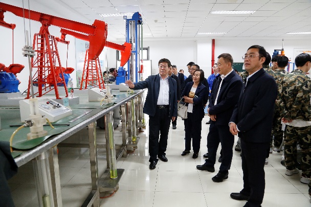 李文生一行先后参观了3D打印技术实训室、数控加工技术实训室、虚拟仿真技术体验室及钻井、采油工程技术等石油工业实训室,对中心的工程实践训练科目、虚拟仿真技术开发及教学应用进行了重点调研和观摩。