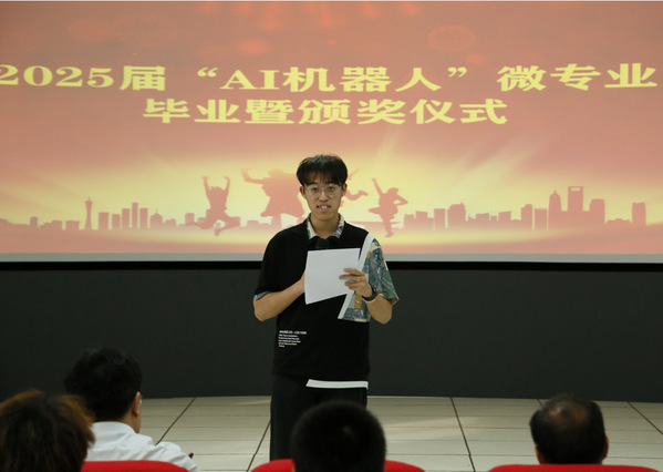 保送大连理工大学读研的优秀毕业生代表干子谦分享了自己借助“AI机器人”微专业平台获多项国奖、促进主专业学习质量的经历;获评微专业一等奖学金的优秀学生代表赵彦宁分享了自己依托工训中心创新平台,参与大创项目、学科竞赛,发表3篇SCI论文、获批3项发明专利、获得3个国家级竞赛奖励的成长过程,充分印证“AI机器人”微专业培养模式的实践价值。