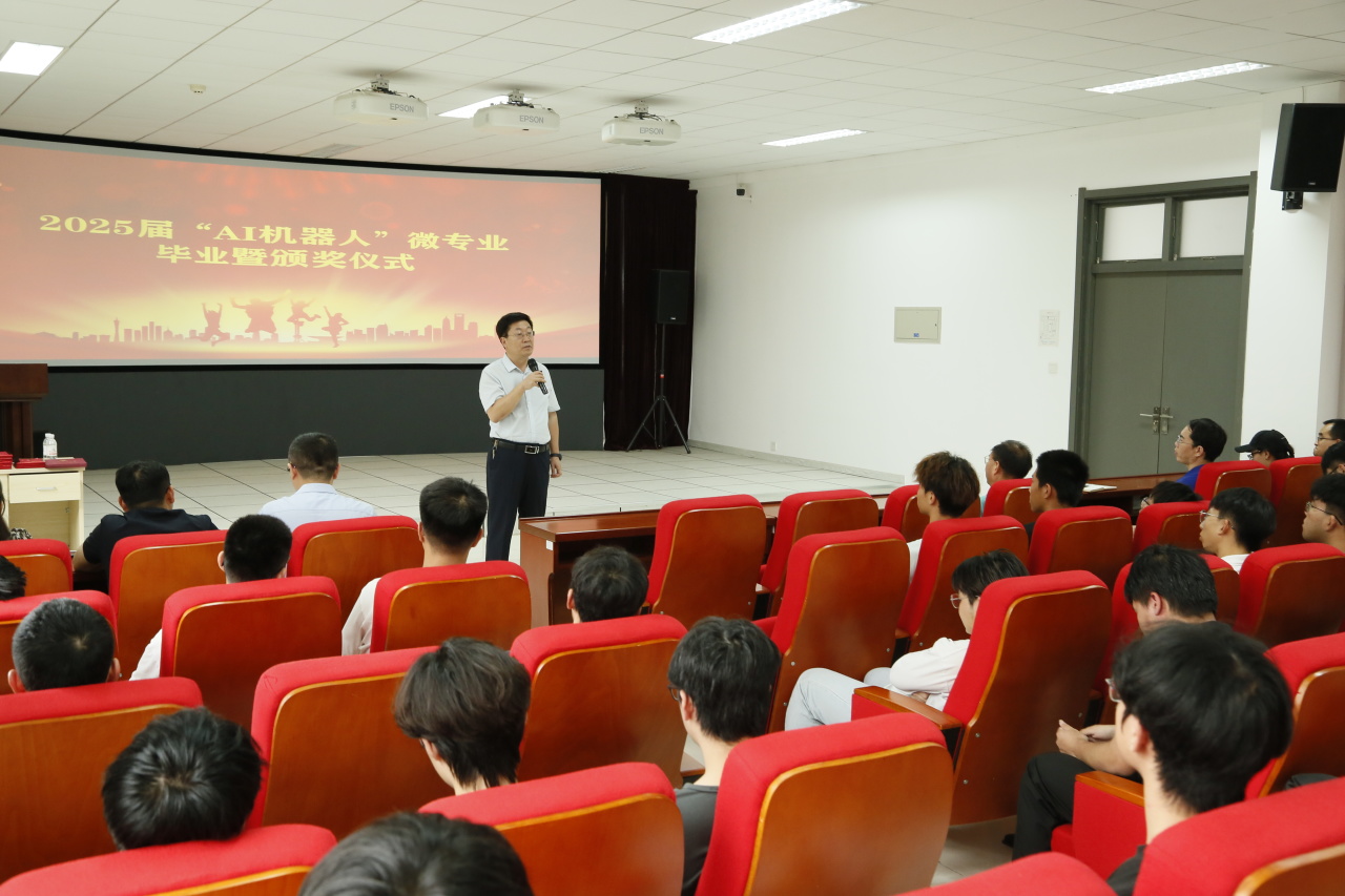 威廉希尔williamhill平台常务副主任马建民作为微专业负责人致辞,简要回顾了“AI机器人”微专业的创办初衷与建设历程,充分肯定了同学们在理论学习和工程实践中的显著进步,更寄语学子们要“立足前沿技术,把握智能时代机遇,创造美好未来”。