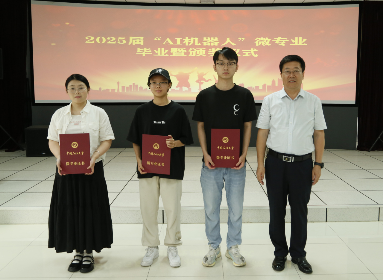 根据4个学期内学生的理论学习、实践能力、创新素质等情况,共评出一等奖学金3人、二等奖学金7人、三等奖学金22人。马建民、刘振东为32名毕业生颁发毕业证书及荣誉证书,并寄语学子们以所学为翼,在AI机器人领域中继续探索,将课堂所学应用于工程实际,在更辽阔的舞台上书写属于石大学子的青春答卷。