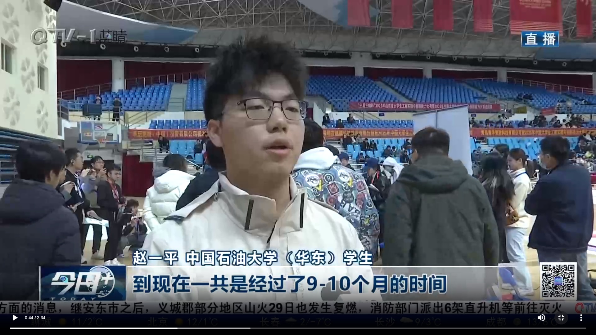 竞赛期间,青岛电视台对赛事进行现场直播报道,我校参赛学生赵一平接受采访。