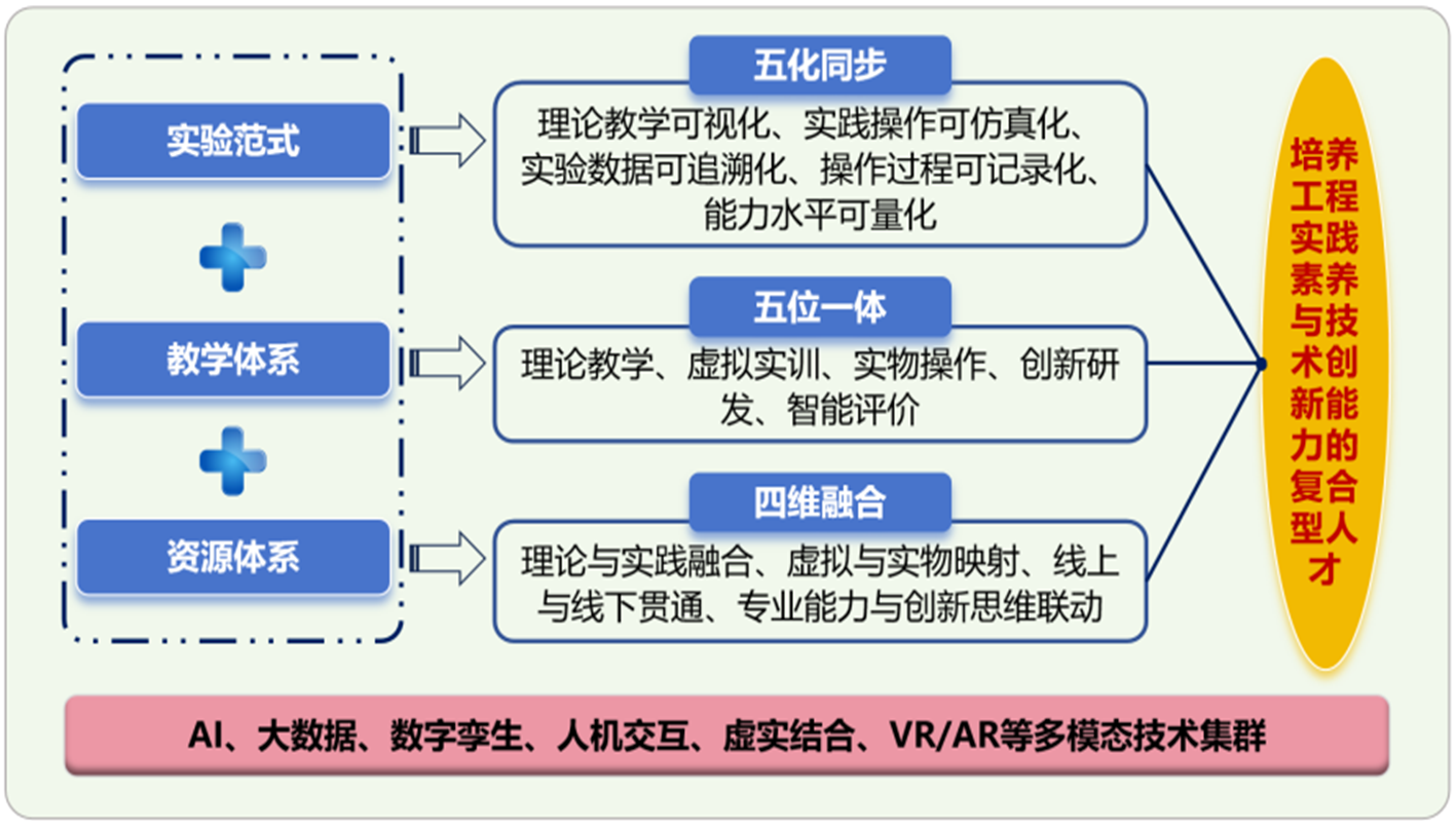 该实验室依托“国家级虚拟仿真实验教学中心”和“国家级实验教学示范中心”,下设钻井技术、固完井技术和修井技术3个实验室,并配备2个虚拟仿真实验室和2个工程实践与创新实验室。实验室坚持以“学为中心、技术赋能、虚实共生、能力跃升”为核心理念,以“技术赋能教学、数据驱动创新”为主线,构建了“四维融合”递进式虚拟仿真资源体系,形成“五位一体”油气钻井虚拟仿真教学体系,实现“五化同步”新型实验范式,在国内外产生了良好的示范与辐射效应。