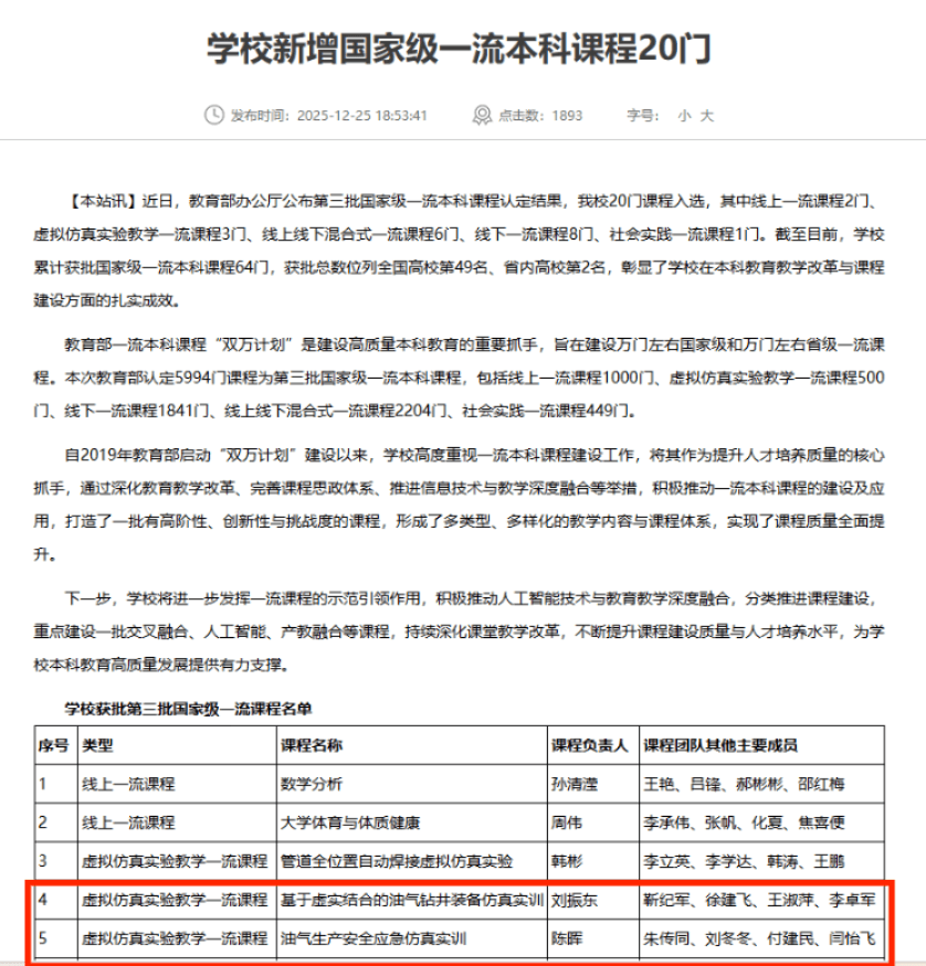 中心以虚拟仿真技术为核心,对自主研发的石油仿真系列教学装备进行了数智化升级;构建“数字孪生+AI”双驱动多模态智慧实践平台,形成“五化同步”实验教学新范式;高质量完成课程知识图谱建设投入教学应用,有效赋能个性化学习与教学精准化开展;科技赋能构建优质资源生态,开发的虚拟仿真动画教学资源已达1300多小时时长;积极申报教育部“人工智能+高等教育”典型案例,报送的“数字资源‘走出去’案例”已顺利通过省级遴选,进入全国评选阶段,进一步展现中心优质数字资源的建设水平。