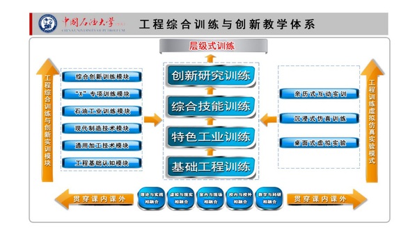 工程实训立足于国家高等工程教育要求,以培养大学生创新实践能力为目标,以机械制造工程训练为主线,全面落实“学生中心、产出导向、持续改进”的教学理念,在加强理论与实践、虚拟与现实、室内与现场、教学与科研、校内与校外“五融合”基础上,按照涵盖基础工程认知、通用加工、现代制造、石油特色、X专项、综合创新的六个模块,以基础工业训练、特色石油训练、综合技能培训、创新研究训练四个层级为平台,将工程教育理念和有关知识贯穿于威廉希尔williamhill官网的全过程,建立“多模块、分层次、阶段化、递进式”的X专项实训教学模式,构建“五融合、四层次、六模块”创新型工程训练体系,全面提高威廉希尔williamhill官网质量和大学生创新实践能力。